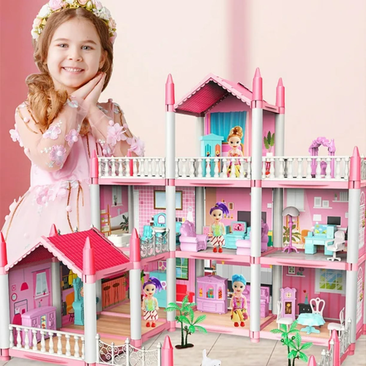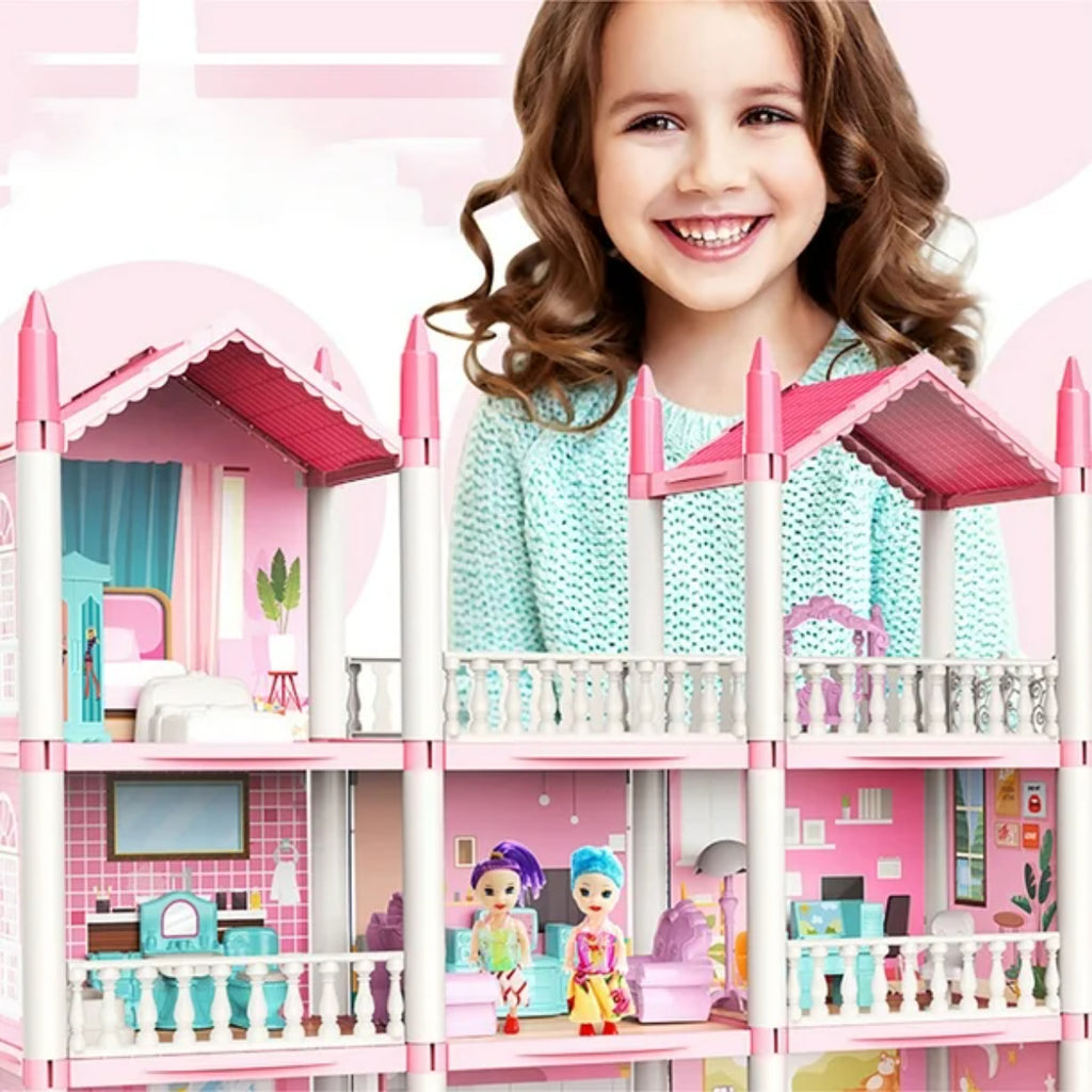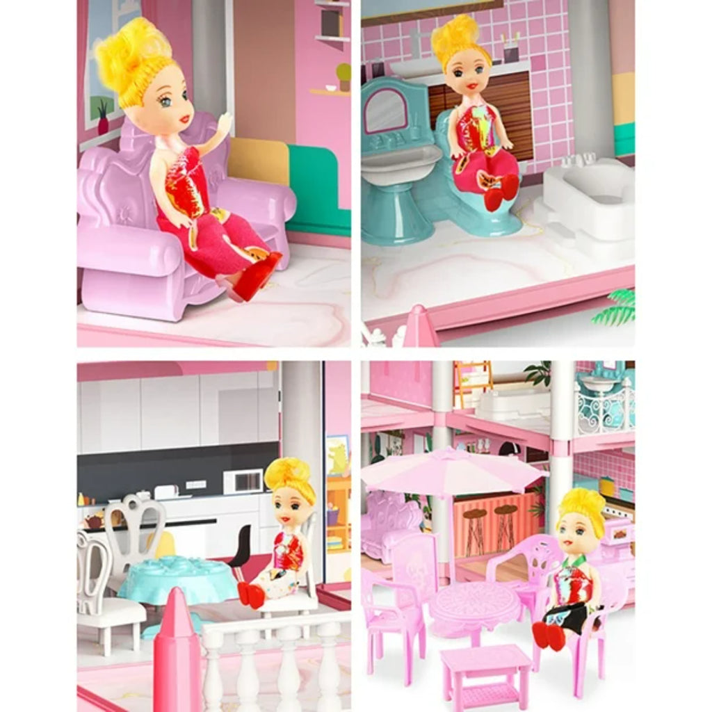 Casa de Muñecas Rosa con Muñecas y Accesorios